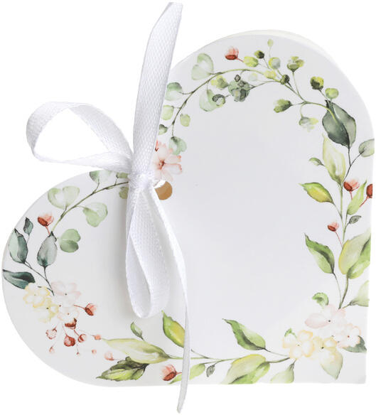 Ajándék doboz - szív masnival 6 db Szép  esküvői  szokás meglepni a vendégeket egy kis ajándékkal. Csomagolja őket ezekbe a gyönyörű  ajándék dobozokba , amelyek biztosan mindenki tetszését elnyerik. Válogasson a dobozaink széles kínálatából. Ez az érdekes virágmintás doboz szív alakú és szatén szalaggal van átkötve.